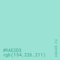 Цвет #9AE2D3 в цветовой модели RGB обозначается тремя октетами (154, 226, 211) в десятичном формате и #9AE2D3 в шестнадцатиричном (hex) формате, которые являются интенсивностью красного 154 (hex 9A), интенсивность зелёного 226 (hex E2) и интенсивность синего 211 (hex D3).