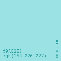 Цвет #9AE2E3 в цветовой модели RGB обозначается тремя октетами (154, 226, 227) в десятичном формате и #9AE2E3 в шестнадцатиричном (hex) формате, которые являются интенсивностью красного 154 (hex 9A), интенсивность зелёного 226 (hex E2) и интенсивность синего 227 (hex E3).