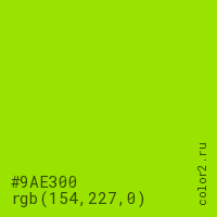 Цвет #9AE300 в цветовой модели RGB обозначается тремя октетами (154, 227, 0) в десятичном формате и #9AE300 в шестнадцатиричном (hex) формате, которые являются интенсивностью красного 154 (hex 9A), интенсивность зелёного 227 (hex E3) и интенсивность синего 0 (hex 00).