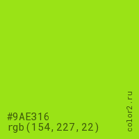 Цвет #9AE316 в цветовой модели RGB обозначается тремя октетами (154, 227, 22) в десятичном формате и #9AE316 в шестнадцатиричном (hex) формате, которые являются интенсивностью красного 154 (hex 9A), интенсивность зелёного 227 (hex E3) и интенсивность синего 22 (hex 16).