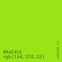 Цвет #9AE416 в цветовой модели RGB обозначается тремя октетами (154, 228, 22) в десятичном формате и #9AE416 в шестнадцатиричном (hex) формате, которые являются интенсивностью красного 154 (hex 9A), интенсивность зелёного 228 (hex E4) и интенсивность синего 22 (hex 16).