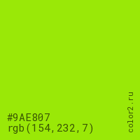 Цвет #9AE807 в цветовой модели RGB обозначается тремя октетами (154, 232, 7) в десятичном формате и #9AE807 в шестнадцатиричном (hex) формате, которые являются интенсивностью красного 154 (hex 9A), интенсивность зелёного 232 (hex E8) и интенсивность синего 7 (hex 07).
