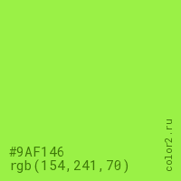 Цвет #9AF146 в цветовой модели RGB обозначается тремя октетами (154, 241, 70) в десятичном формате и #9AF146 в шестнадцатиричном (hex) формате, которые являются интенсивностью красного 154 (hex 9A), интенсивность зелёного 241 (hex F1) и интенсивность синего 70 (hex 46).