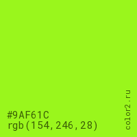 Цвет #9AF61C в цветовой модели RGB обозначается тремя октетами (154, 246, 28) в десятичном формате и #9AF61C в шестнадцатиричном (hex) формате, которые являются интенсивностью красного 154 (hex 9A), интенсивность зелёного 246 (hex F6) и интенсивность синего 28 (hex 1C).