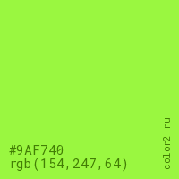 Цвет #9AF740 в цветовой модели RGB обозначается тремя октетами (154, 247, 64) в десятичном формате и #9AF740 в шестнадцатиричном (hex) формате, которые являются интенсивностью красного 154 (hex 9A), интенсивность зелёного 247 (hex F7) и интенсивность синего 64 (hex 40).