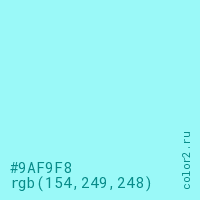 Цвет #9AF9F8 в цветовой модели RGB обозначается тремя октетами (154, 249, 248) в десятичном формате и #9AF9F8 в шестнадцатиричном (hex) формате, которые являются интенсивностью красного 154 (hex 9A), интенсивность зелёного 249 (hex F9) и интенсивность синего 248 (hex F8).