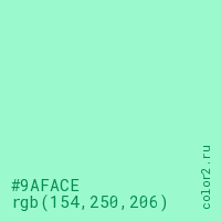 Цвет #9AFACE в цветовой модели RGB обозначается тремя октетами (154, 250, 206) в десятичном формате и #9AFACE в шестнадцатиричном (hex) формате, которые являются интенсивностью красного 154 (hex 9A), интенсивность зелёного 250 (hex FA) и интенсивность синего 206 (hex CE).