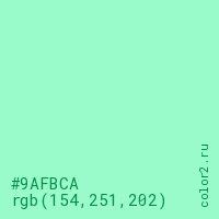 Цвет #9AFBCA в цветовой модели RGB обозначается тремя октетами (154, 251, 202) в десятичном формате и #9AFBCA в шестнадцатиричном (hex) формате, которые являются интенсивностью красного 154 (hex 9A), интенсивность зелёного 251 (hex FB) и интенсивность синего 202 (hex CA).