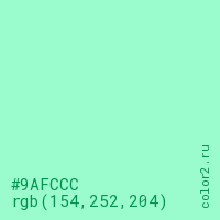 Цвет #9AFCCC в цветовой модели RGB обозначается тремя октетами (154, 252, 204) в десятичном формате и #9AFCCC в шестнадцатиричном (hex) формате, которые являются интенсивностью красного 154 (hex 9A), интенсивность зелёного 252 (hex FC) и интенсивность синего 204 (hex CC).