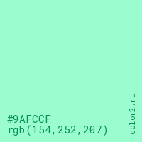 Цвет #9AFCCF в цветовой модели RGB обозначается тремя октетами (154, 252, 207) в десятичном формате и #9AFCCF в шестнадцатиричном (hex) формате, которые являются интенсивностью красного 154 (hex 9A), интенсивность зелёного 252 (hex FC) и интенсивность синего 207 (hex CF).