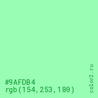 Цвет #9AFDB4 в цветовой модели RGB обозначается тремя октетами (154, 253, 180) в десятичном формате и #9AFDB4 в шестнадцатиричном (hex) формате, которые являются интенсивностью красного 154 (hex 9A), интенсивность зелёного 253 (hex FD) и интенсивность синего 180 (hex B4).