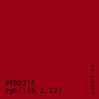 Цвет #9B0216 в цветовой модели RGB обозначается тремя октетами (155, 2, 22) в десятичном формате и #9B0216 в шестнадцатиричном (hex) формате, которые являются интенсивностью красного 155 (hex 9B), интенсивность зелёного 2 (hex 02) и интенсивность синего 22 (hex 16).