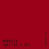 Цвет #9B021A в цветовой модели RGB обозначается тремя октетами (155, 2, 26) в десятичном формате и #9B021A в шестнадцатиричном (hex) формате, которые являются интенсивностью красного 155 (hex 9B), интенсивность зелёного 2 (hex 02) и интенсивность синего 26 (hex 1A).