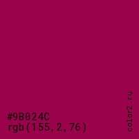 Цвет #9B024C в цветовой модели RGB обозначается тремя октетами (155, 2, 76) в десятичном формате и #9B024C в шестнадцатиричном (hex) формате, которые являются интенсивностью красного 155 (hex 9B), интенсивность зелёного 2 (hex 02) и интенсивность синего 76 (hex 4C).