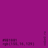 Цвет #9B1081 в цветовой модели RGB обозначается тремя октетами (155, 16, 129) в десятичном формате и #9B1081 в шестнадцатиричном (hex) формате, которые являются интенсивностью красного 155 (hex 9B), интенсивность зелёного 16 (hex 10) и интенсивность синего 129 (hex 81).