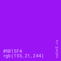 Цвет #9B15F4 в цветовой модели RGB обозначается тремя октетами (155, 21, 244) в десятичном формате и #9B15F4 в шестнадцатиричном (hex) формате, которые являются интенсивностью красного 155 (hex 9B), интенсивность зелёного 21 (hex 15) и интенсивность синего 244 (hex F4).