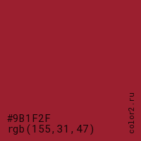 Цвет #9B1F2F в цветовой модели RGB обозначается тремя октетами (155, 31, 47) в десятичном формате и #9B1F2F в шестнадцатиричном (hex) формате, которые являются интенсивностью красного 155 (hex 9B), интенсивность зелёного 31 (hex 1F) и интенсивность синего 47 (hex 2F).