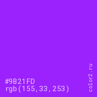 Цвет #9B21FD в цветовой модели RGB обозначается тремя октетами (155, 33, 253) в десятичном формате и #9B21FD в шестнадцатиричном (hex) формате, которые являются интенсивностью красного 155 (hex 9B), интенсивность зелёного 33 (hex 21) и интенсивность синего 253 (hex FD).