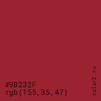 Цвет #9B232F в цветовой модели RGB обозначается тремя октетами (155, 35, 47) в десятичном формате и #9B232F в шестнадцатиричном (hex) формате, которые являются интенсивностью красного 155 (hex 9B), интенсивность зелёного 35 (hex 23) и интенсивность синего 47 (hex 2F).