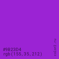 Цвет #9B23D4 в цветовой модели RGB обозначается тремя октетами (155, 35, 212) в десятичном формате и #9B23D4 в шестнадцатиричном (hex) формате, которые являются интенсивностью красного 155 (hex 9B), интенсивность зелёного 35 (hex 23) и интенсивность синего 212 (hex D4).