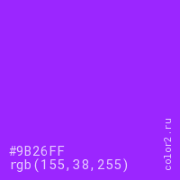 Цвет #9B26FF в цветовой модели RGB обозначается тремя октетами (155, 38, 255) в десятичном формате и #9B26FF в шестнадцатиричном (hex) формате, которые являются интенсивностью красного 155 (hex 9B), интенсивность зелёного 38 (hex 26) и интенсивность синего 255 (hex FF).