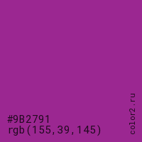 Цвет #9B2791 в цветовой модели RGB обозначается тремя октетами (155, 39, 145) в десятичном формате и #9B2791 в шестнадцатиричном (hex) формате, которые являются интенсивностью красного 155 (hex 9B), интенсивность зелёного 39 (hex 27) и интенсивность синего 145 (hex 91).