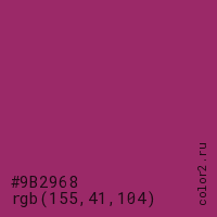 Цвет #9B2968 в цветовой модели RGB обозначается тремя октетами (155, 41, 104) в десятичном формате и #9B2968 в шестнадцатиричном (hex) формате, которые являются интенсивностью красного 155 (hex 9B), интенсивность зелёного 41 (hex 29) и интенсивность синего 104 (hex 68).