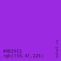 Цвет #9B29E2 в цветовой модели RGB обозначается тремя октетами (155, 41, 226) в десятичном формате и #9B29E2 в шестнадцатиричном (hex) формате, которые являются интенсивностью красного 155 (hex 9B), интенсивность зелёного 41 (hex 29) и интенсивность синего 226 (hex E2).
