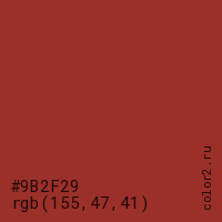 Цвет #9B2F29 в цветовой модели RGB обозначается тремя октетами (155, 47, 41) в десятичном формате и #9B2F29 в шестнадцатиричном (hex) формате, которые являются интенсивностью красного 155 (hex 9B), интенсивность зелёного 47 (hex 2F) и интенсивность синего 41 (hex 29).