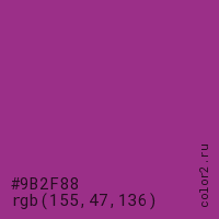 Цвет #9B2F88 в цветовой модели RGB обозначается тремя октетами (155, 47, 136) в десятичном формате и #9B2F88 в шестнадцатиричном (hex) формате, которые являются интенсивностью красного 155 (hex 9B), интенсивность зелёного 47 (hex 2F) и интенсивность синего 136 (hex 88).