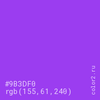 Цвет #9B3DF0 в цветовой модели RGB обозначается тремя октетами (155, 61, 240) в десятичном формате и #9B3DF0 в шестнадцатиричном (hex) формате, которые являются интенсивностью красного 155 (hex 9B), интенсивность зелёного 61 (hex 3D) и интенсивность синего 240 (hex F0).