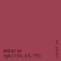 Цвет #9B414F в цветовой модели RGB обозначается тремя октетами (155, 65, 79) в десятичном формате и #9B414F в шестнадцатиричном (hex) формате, которые являются интенсивностью красного 155 (hex 9B), интенсивность зелёного 65 (hex 41) и интенсивность синего 79 (hex 4F).