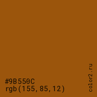 Цвет #9B550C в цветовой модели RGB обозначается тремя октетами (155, 85, 12) в десятичном формате и #9B550C в шестнадцатиричном (hex) формате, которые являются интенсивностью красного 155 (hex 9B), интенсивность зелёного 85 (hex 55) и интенсивность синего 12 (hex 0C).