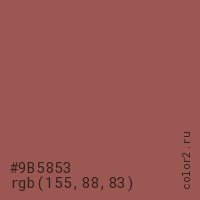 Цвет #9B5853 в цветовой модели RGB обозначается тремя октетами (155, 88, 83) в десятичном формате и #9B5853 в шестнадцатиричном (hex) формате, которые являются интенсивностью красного 155 (hex 9B), интенсивность зелёного 88 (hex 58) и интенсивность синего 83 (hex 53).