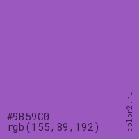 Цвет #9B59C0 в цветовой модели RGB обозначается тремя октетами (155, 89, 192) в десятичном формате и #9B59C0 в шестнадцатиричном (hex) формате, которые являются интенсивностью красного 155 (hex 9B), интенсивность зелёного 89 (hex 59) и интенсивность синего 192 (hex C0).