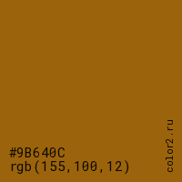 Цвет #9B640C в цветовой модели RGB обозначается тремя октетами (155, 100, 12) в десятичном формате и #9B640C в шестнадцатиричном (hex) формате, которые являются интенсивностью красного 155 (hex 9B), интенсивность зелёного 100 (hex 64) и интенсивность синего 12 (hex 0C).