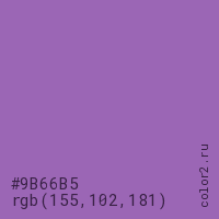 Цвет #9B66B5 в цветовой модели RGB обозначается тремя октетами (155, 102, 181) в десятичном формате и #9B66B5 в шестнадцатиричном (hex) формате, которые являются интенсивностью красного 155 (hex 9B), интенсивность зелёного 102 (hex 66) и интенсивность синего 181 (hex B5).