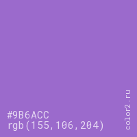 Цвет #9B6ACC в цветовой модели RGB обозначается тремя октетами (155, 106, 204) в десятичном формате и #9B6ACC в шестнадцатиричном (hex) формате, которые являются интенсивностью красного 155 (hex 9B), интенсивность зелёного 106 (hex 6A) и интенсивность синего 204 (hex CC).