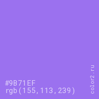 Цвет #9B71EF в цветовой модели RGB обозначается тремя октетами (155, 113, 239) в десятичном формате и #9B71EF в шестнадцатиричном (hex) формате, которые являются интенсивностью красного 155 (hex 9B), интенсивность зелёного 113 (hex 71) и интенсивность синего 239 (hex EF).