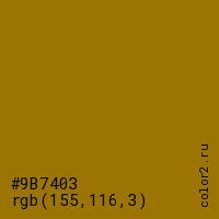 Цвет #9B7403 в цветовой модели RGB обозначается тремя октетами (155, 116, 3) в десятичном формате и #9B7403 в шестнадцатиричном (hex) формате, которые являются интенсивностью красного 155 (hex 9B), интенсивность зелёного 116 (hex 74) и интенсивность синего 3 (hex 03).