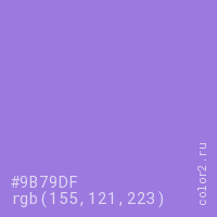 Цвет #9B79DF в цветовой модели RGB обозначается тремя октетами (155, 121, 223) в десятичном формате и #9B79DF в шестнадцатиричном (hex) формате, которые являются интенсивностью красного 155 (hex 9B), интенсивность зелёного 121 (hex 79) и интенсивность синего 223 (hex DF).