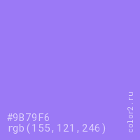 Цвет RGB(155, 121, 246) в процентом отношении количества цвета состоит из 60.8% красного (red), 47.5% зелёного (green) и 96.5% синего (blue).
