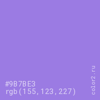 Цвет #9B7BE3 в цветовой модели RGB обозначается тремя октетами (155, 123, 227) в десятичном формате и #9B7BE3 в шестнадцатиричном (hex) формате, которые являются интенсивностью красного 155 (hex 9B), интенсивность зелёного 123 (hex 7B) и интенсивность синего 227 (hex E3).