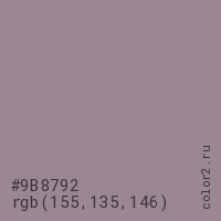 Цвет #9B8792 в цветовой модели RGB обозначается тремя октетами (155, 135, 146) в десятичном формате и #9B8792 в шестнадцатиричном (hex) формате, которые являются интенсивностью красного 155 (hex 9B), интенсивность зелёного 135 (hex 87) и интенсивность синего 146 (hex 92).
