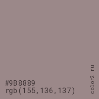 Цвет #9B8889 в цветовой модели RGB обозначается тремя октетами (155, 136, 137) в десятичном формате и #9B8889 в шестнадцатиричном (hex) формате, которые являются интенсивностью красного 155 (hex 9B), интенсивность зелёного 136 (hex 88) и интенсивность синего 137 (hex 89).