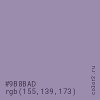 Цвет #9B8BAD в цветовой модели RGB обозначается тремя октетами (155, 139, 173) в десятичном формате и #9B8BAD в шестнадцатиричном (hex) формате, которые являются интенсивностью красного 155 (hex 9B), интенсивность зелёного 139 (hex 8B) и интенсивность синего 173 (hex AD).
