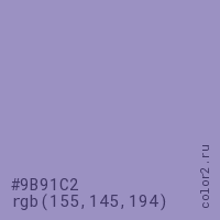 Цвет #9B91C2 в цветовой модели RGB обозначается тремя октетами (155, 145, 194) в десятичном формате и #9B91C2 в шестнадцатиричном (hex) формате, которые являются интенсивностью красного 155 (hex 9B), интенсивность зелёного 145 (hex 91) и интенсивность синего 194 (hex C2).