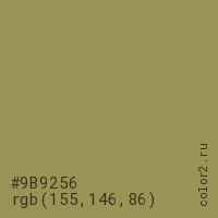 Цвет #9B9256 в цветовой модели RGB обозначается тремя октетами (155, 146, 86) в десятичном формате и #9B9256 в шестнадцатиричном (hex) формате, которые являются интенсивностью красного 155 (hex 9B), интенсивность зелёного 146 (hex 92) и интенсивность синего 86 (hex 56).