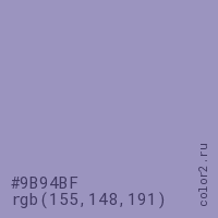 Цвет #9B94BF в цветовой модели RGB обозначается тремя октетами (155, 148, 191) в десятичном формате и #9B94BF в шестнадцатиричном (hex) формате, которые являются интенсивностью красного 155 (hex 9B), интенсивность зелёного 148 (hex 94) и интенсивность синего 191 (hex BF).
