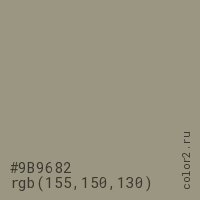 Цвет #9B9682 в цветовой модели RGB обозначается тремя октетами (155, 150, 130) в десятичном формате и #9B9682 в шестнадцатиричном (hex) формате, которые являются интенсивностью красного 155 (hex 9B), интенсивность зелёного 150 (hex 96) и интенсивность синего 130 (hex 82).